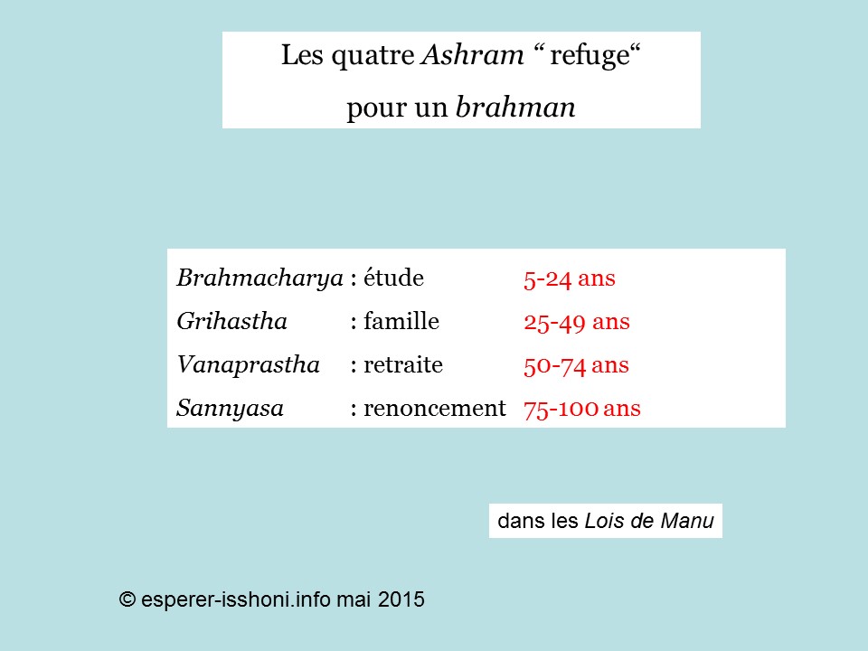 11§ Les lois de Manu relèvent du dharmasastra, du traité de la Loi, dans la catégorie des textes de tradition humaine, smrti. On y trouve en particulier la théorie des quatre âges de la vie du brahmane.