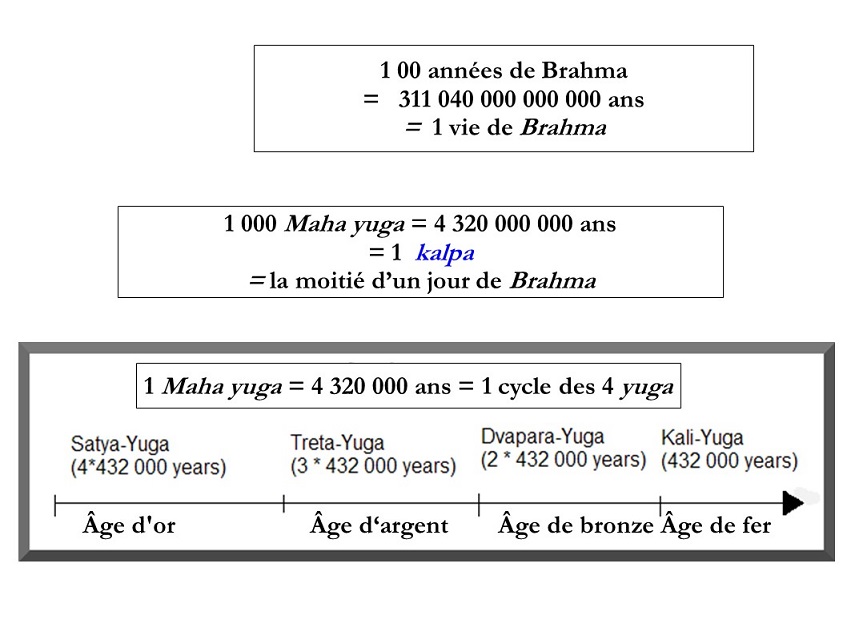 8§ Dans la cosmologie indienne, l’univers apparaît puis se dissout (pralaya) dans l’océan primordial, la dissolution survenant à chaque fin de kalpa (4, 32 milliards d’années d’après le Vishnou purana [4], soit un jour de Brahma ou mille mahayugas) et à chaque fin de vie de Brahma (100 ans, chaque année étant composée de 360 jours – et nuits - de Brahma soit en tout 2*100*360*4,32 = 311 040 milliards d’années) [5].