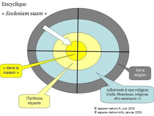 L’espace du salut peut déborder le cadre des apparences formelles. D’autres lieux et modes dordination” au Corps du Christ peuvent exister. Paul VI le rappelait dans sa première encyclique, Ecclesiam suam, en évoquant la pluralité des « cercles du dialogue du salut ». Le Concile a défini ces “cercles” comme des espaces d’appartenance et d’ordination” à l’Église. Voilà le véritable sens de la formule bien connue : ‘Hors de l ‘Église, point de salut’. » [22]