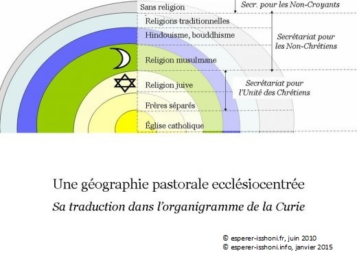 34. En ce sens, la cartographie de Nostra Aetate vient conclure le mouvement des trois cartographies précédentes, en déplaçant le cercle du judaïsme de manière radicale par rapport à elles – cf. le changement de couleur de ce cercle, déjà mentionné plus haut.