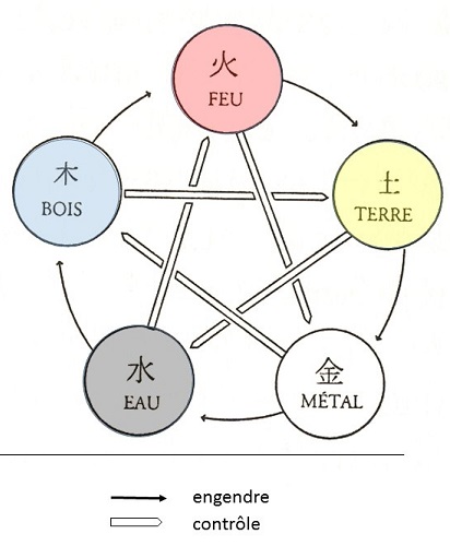 Tableau des cycles de génération et de contrôle des cinq phases, d’après l’article 五行思想 (japonais) dans Wikipedia
