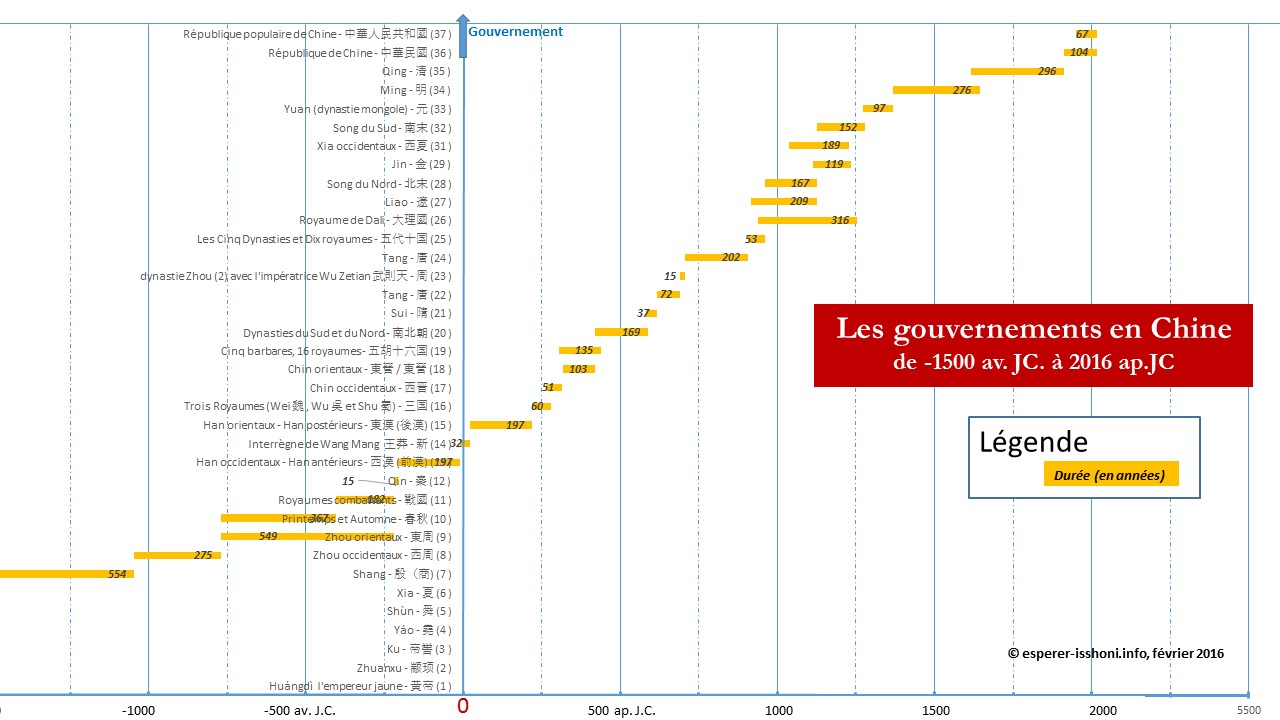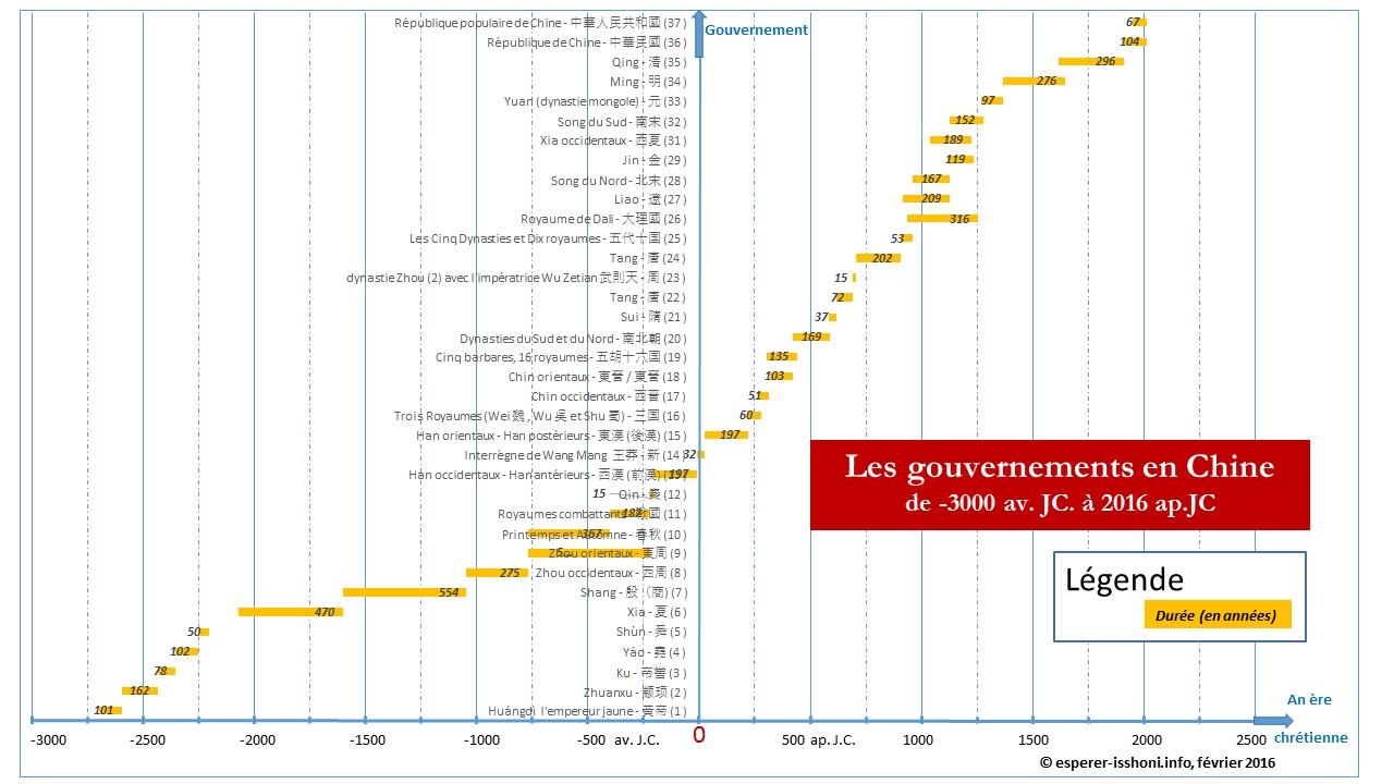 - nous avons utilisé le calendrier grégorien pour les dates, l’an zéro étant par convention la date de naissance de Jésus Christ. La vision chinoise considère sans doute que l’an zéro remonte à plusieurs millénaires avant la naissance du Christ ;