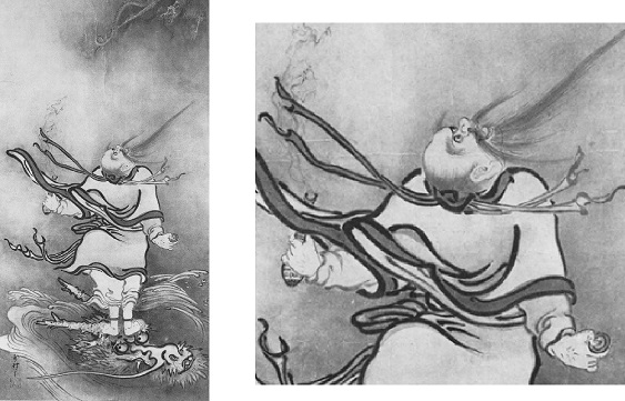 1§ Sur l’image, le sage taoïste monte en plein jour dans le Ciel, juché sur un dragon tandis qu’un autre évolue au-dessus d’eux.