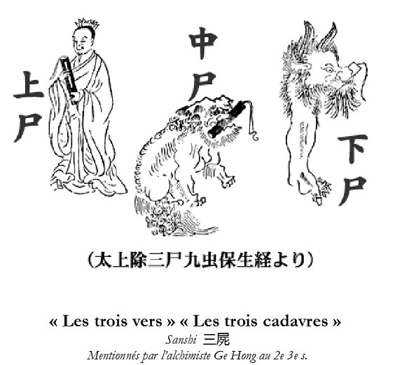 6§ Une autre idée chinoise est que le corps contient trois "vers", trois "cadavres", qui veulent provoquer la mort du corps qui les abrite afin de s’en libérer : l’un est situé dans la tête, l’autre au niveau du thorax et le dernier au niveau des parties basses.