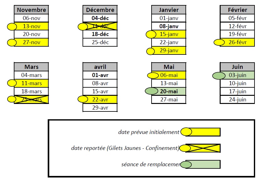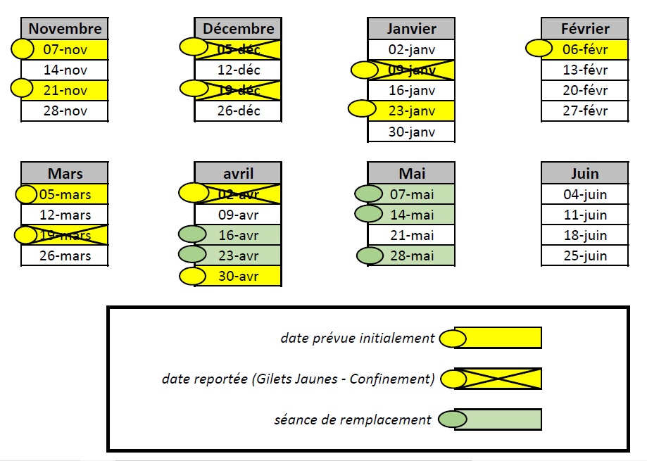 | Jan. 22 – 29 | Fév. 5 – 12 | Mar. 4 – 11 – 18 – 25 | Avr. [9] 1 – 29 | Mai 6 - 13 |