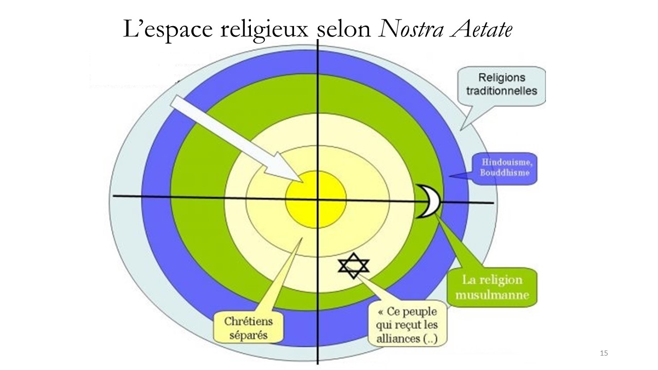 Dans la déclaration, les Pères plaçaient au centre de l’espace religieux le Christ et l’֥Église, et non le christianisme et l’Église catholique romaine car si ces réalités sont liées, elles ne sont pas identiques : les pères conciliaires distinguaient entre la réalité vivante, trans- et méta-historique qu’est le Christ, et son expression rituelle, dogmatique et organisationnelle, le christianisme, qui tire sa vitalité de sa conversion permanente au Christ, de même qu’ils distinguaient entre le corps mystique du Christ, l’Église, de son expression terrestre, l’Église catholique romaine dans laquelle elle « subsiste » [15].