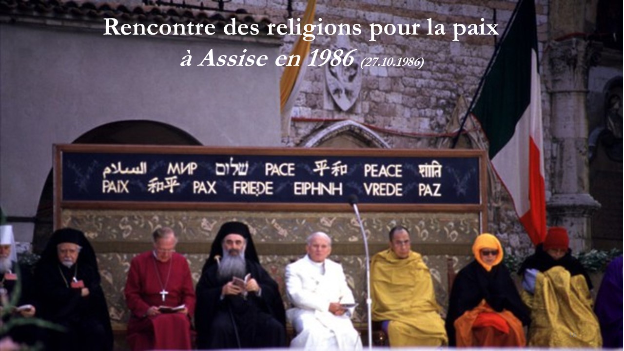 9§. En 1986, le pape Jean Paul II (1920-1978-2005) avait invité les représentants des différentes religions mondiales à Assise en Italie le 27 octobre de la même année afin que chacune mette en œuvre ses ressources proprement religieuses au service de la paix dans le monde. Il partait du principe qu’une religion authentique ne pouvait que servir la paix et l’union entre les hommes. Mon père et moi nous nous étonnions que les religions bouddhiste et chrétienne fassent mal leur travail.