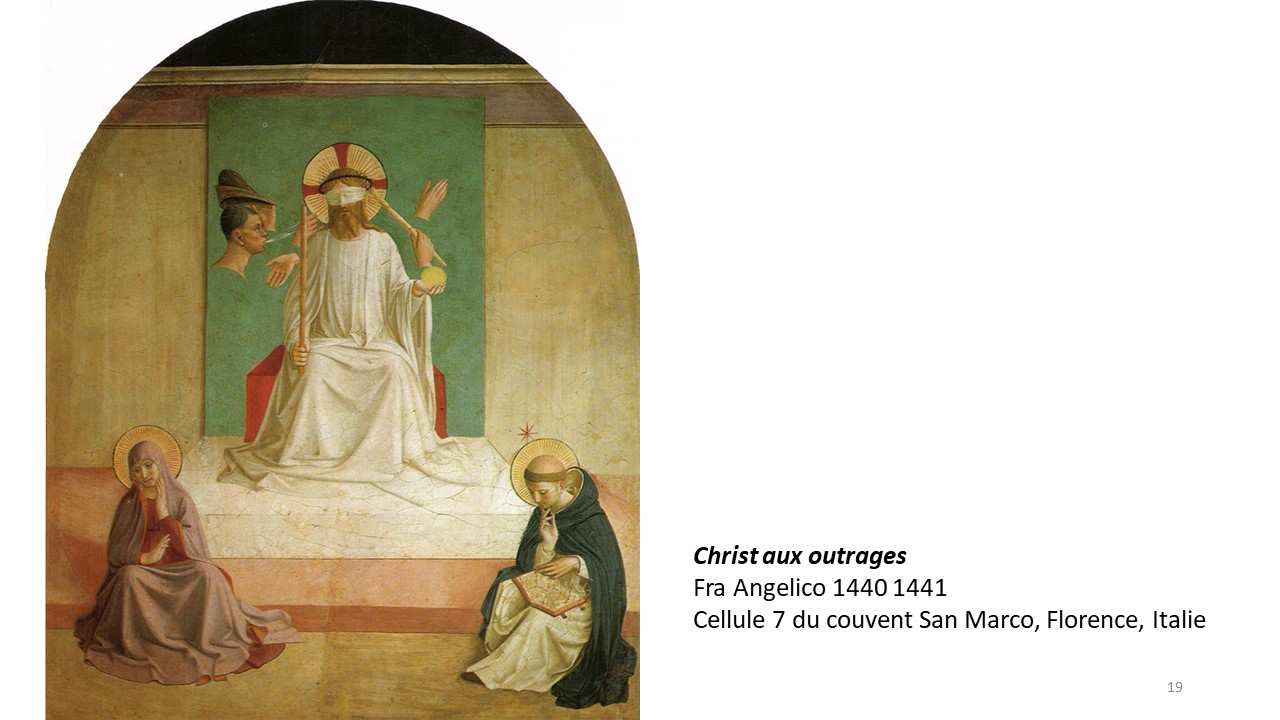 46§. L’image représente Dominique lisant ou plutôt méditant sans doute l’évangile de Matthieu, tandis que le contenu de sa méditation est représenté au-dessus de lui par le peintre : on y voit les différentes humiliations – les outrages à sa dignité - que le Christ a subis avant d’être crucifié.