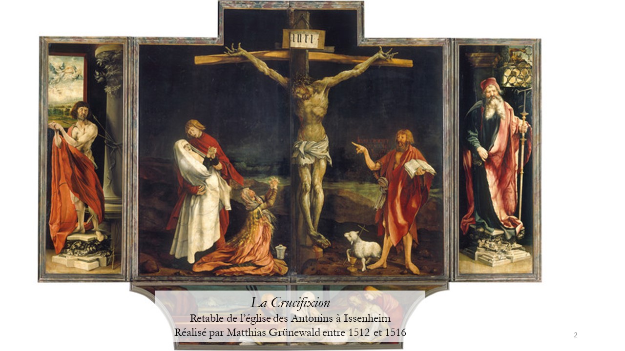 4§. La couverture du livre « Quand les religions font mal » montre une main clouée sur une traverse de bois. Il s’agit d’un détail du retable d’Issenheim (en Alsace) réalisé par Mathias Grünewald entre 1512 et 1516, qui, fermé, représente le Christ en croix.