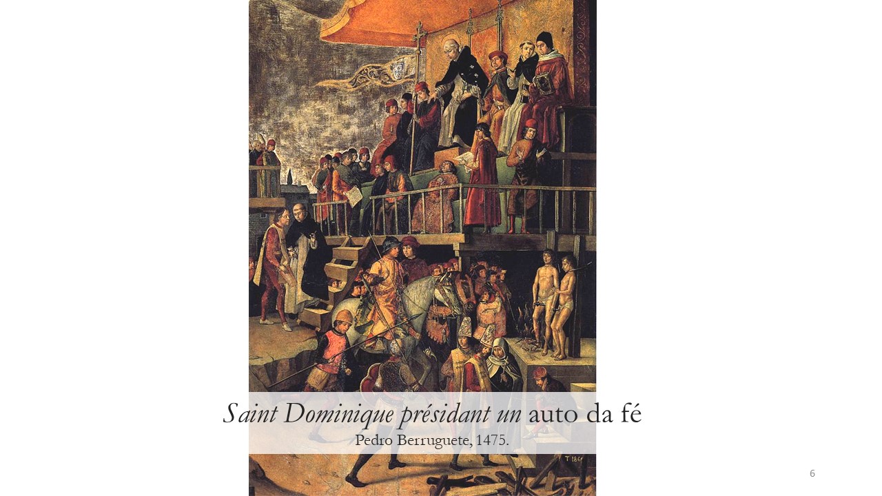 Ainsi, un tableau de Pedro Berruguete daté de 1475 représente le fondateur de mon ordre, Dominique (1170-1221) présidant à un brûlement d’hérétique. Le peintre commettait un anachronisme puisque Dominique était déjà mort depuis dix ans lors de l’institution de l’inquisition pontificale en 1231.