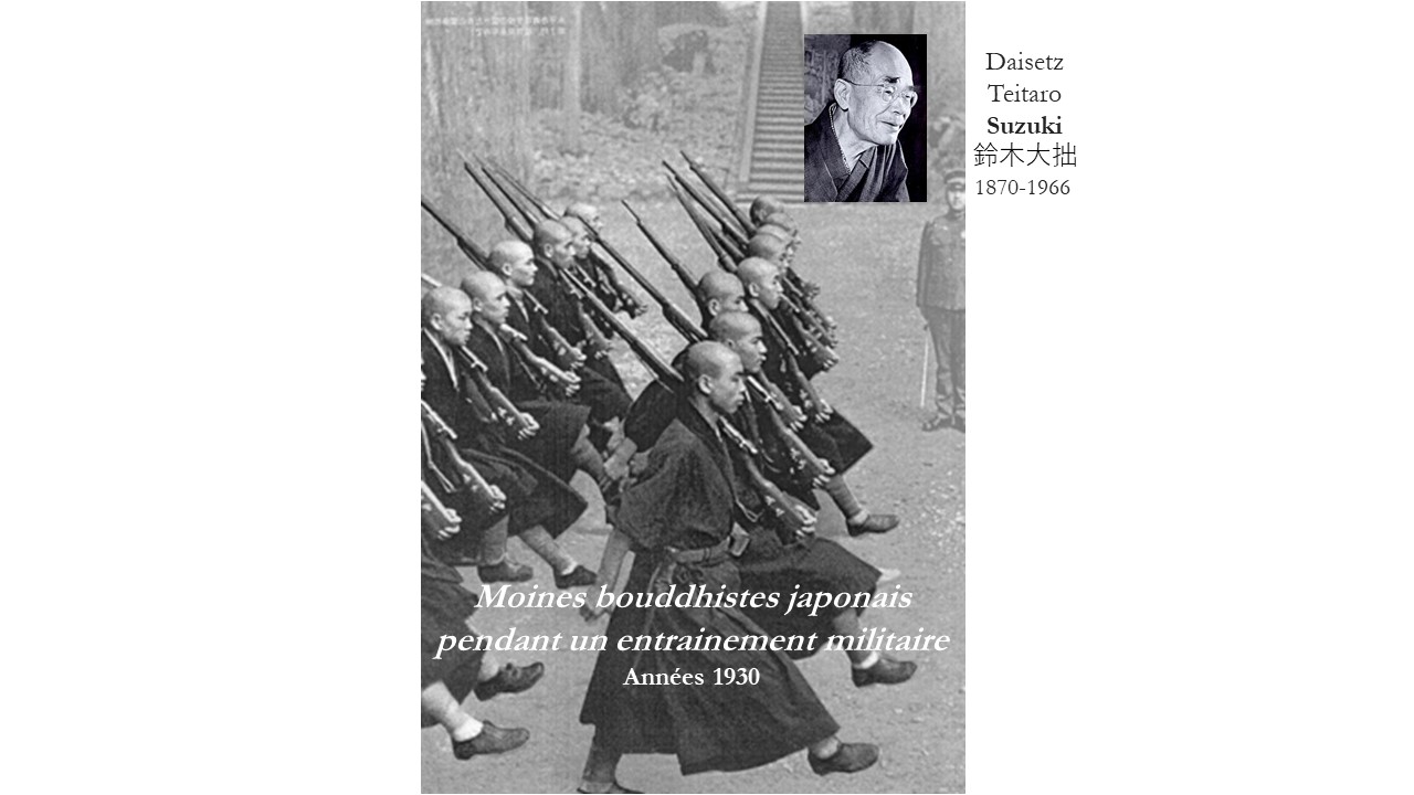 13§. À partir des années 1930, l’Empire du Japon s’est lancé dans une politique de conquête de ses voisins par voie de terre et voie de mer. L’armée impériale japonaise a alors commis des exactions sur les prisonniers de guerre et sur les populations civiles. Or un laïc bouddhiste, Suzuki Daisetz 鈴木大拙 (1870 - 1966), un vulgarisateur du Zen célèbre en Occident, a justifié la guerre d’agression de l’Empire du Japon.