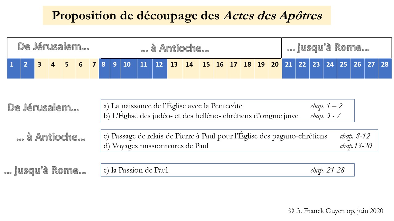 1§ Notre découpage des ACTES DES APÔTRES suit le déploiement géographique de l’annonce de l’Évangile : la Bonne Nouvelle du salut en Jésus Christ – le « kérygme » - commence à être prêchée dans la ville sainte de Jérusalem ; suite à l’évènement déclencheur de la lapidation du premier martyr, le diacre hellène au prénom grec Étienne, la Bonne Nouvelle rayonne à partir d’Antioche avant d’atteindre Rome, la capitale de l’Empire païen romain.