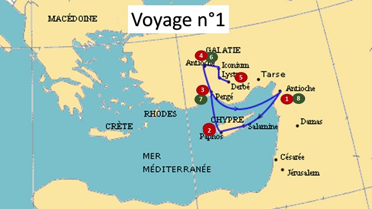 | Chap. 13 (52 v.) | Premier voyage missionnaire L’Esprit Saint demande l’envoi de Barnabé et Saul en mission à l’Église à Antioche de Syrie. Tous deux partent avec l’auxiliaire Jean en mission : Séleucie, puis bateau jusqu’à Chypre (2) puis retour en bateau à Pergé (Pamphylie) (3) d’où Jean part pour Jérusalem ; Barnabas et Paul partent pour Antioche de Pisidie (4), Iconium (5). – À Paphos sur l’île de Chypre, (2) défaite du magicien prophète, Bar Jésus dit Elymas aveuglé face à Saul « ou plutôt Paul » et conversion du proconsul Sergius Paulus. – À Antioche de Pisidie, longue prédication de Paul reprenant l’histoire sainte du peuple hébreu depuis la sortie d’Égypte jusqu’à Jésus et l’accomplissement de la promesse : pardon des péchés et « cette justification que vous n’avez pu trouver dans la loi de Moïse ». Conversion de juifs et de prosélytes. Lors du sabbat suivant, les Juifs s’opposent à la prise de parole de Paul qui prévient qu’ils vont se tourner vers les païens. Agitation des Juifs auprès de notables et de femmes prosélytes de haut rang. Paul et Barnabé sont expulsés de la ville. |