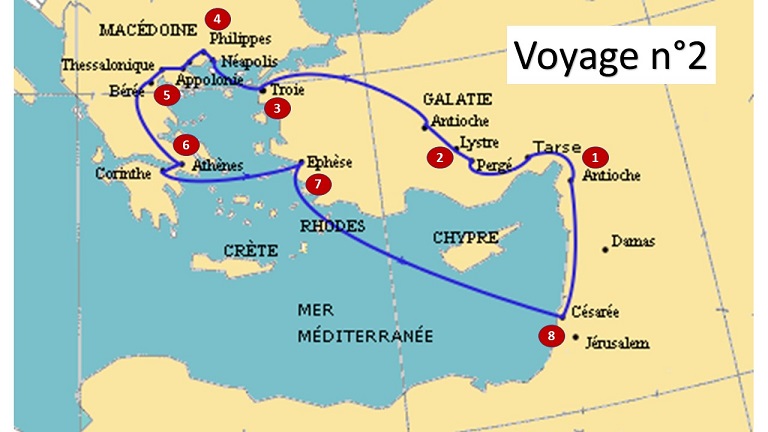 - lors du second, les missionnaires franchissent la Mer Égée pour évangéliser la Macédoine et la Grèce – le narrateur des Actes s’exprime alors en « nous » pour la première fois ;
