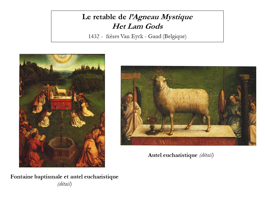 15§ Le retable de l’Agneau Mystique - Het Lam Gods en flamand - à Gand (Belgique) réalisé en 1432 par les frères Van Eyck articule l’évènement unique de la croix et les sacrements grâce à son dispositif pictural : au premier plan coule l’eau d’une fontaine baptismale – le baptême est la porte d’entrée des autres sacrements – tandis qu’à l’arrière-plan se dresse un autel – la table eucharistique – sur lequel se tient débout un agneau « comme immolé » [9] ; un calice posé sur l’autel recueille le sang qui coule de son flanc transpercé.