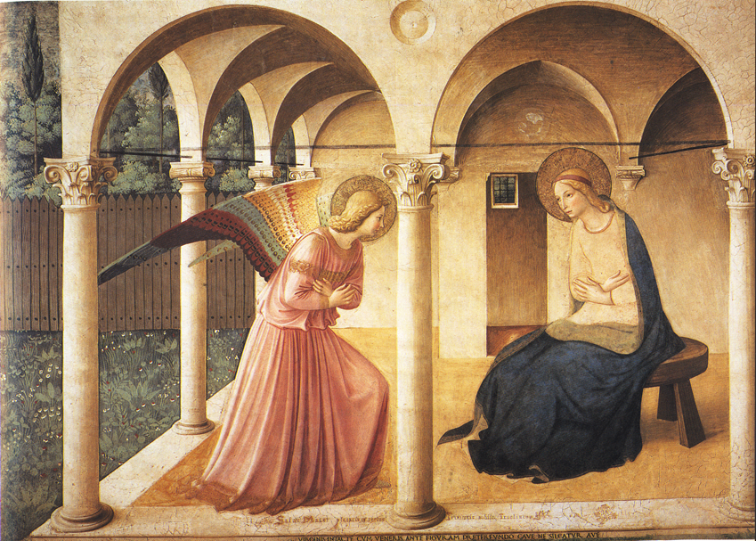 Le trépied – tabouret figure dans la fresque de l’Annonciation à l’entrée du premier étage du couvent de Saint-Marc à Florence. On se rappellera que Marie était comparée à un triclinum, un tabouret, sur lequel repose la sainte Trinité.